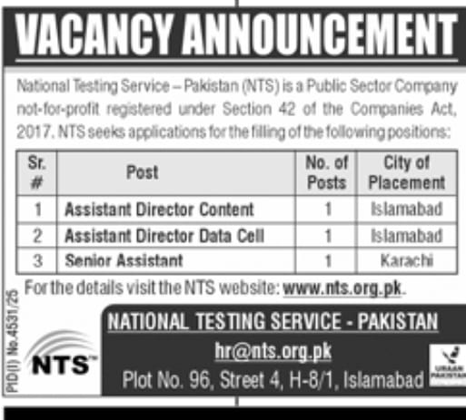 National Testing Service – Pakistan (NTS), a leading public sector not for profit organization registered under Section 42 of the Companies Act 2017, has announced new job openings for qualified professionals.